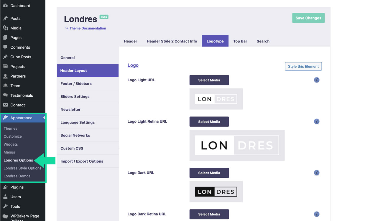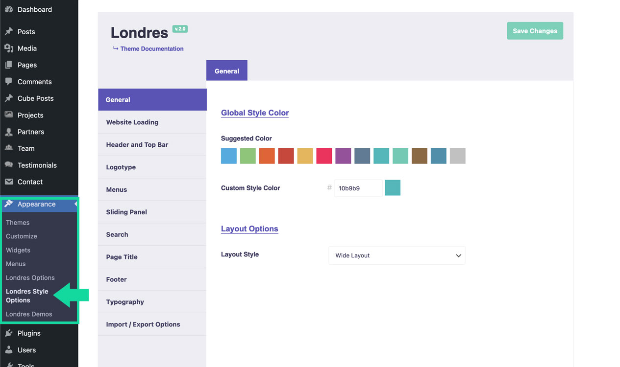 Londres comes with a very powerful options panel. After the theme is installed you can access the options panel by logging into the Wordpress dashboard and clicking Londres Options. Go to menu Appearance -> Londres Options and discover it!