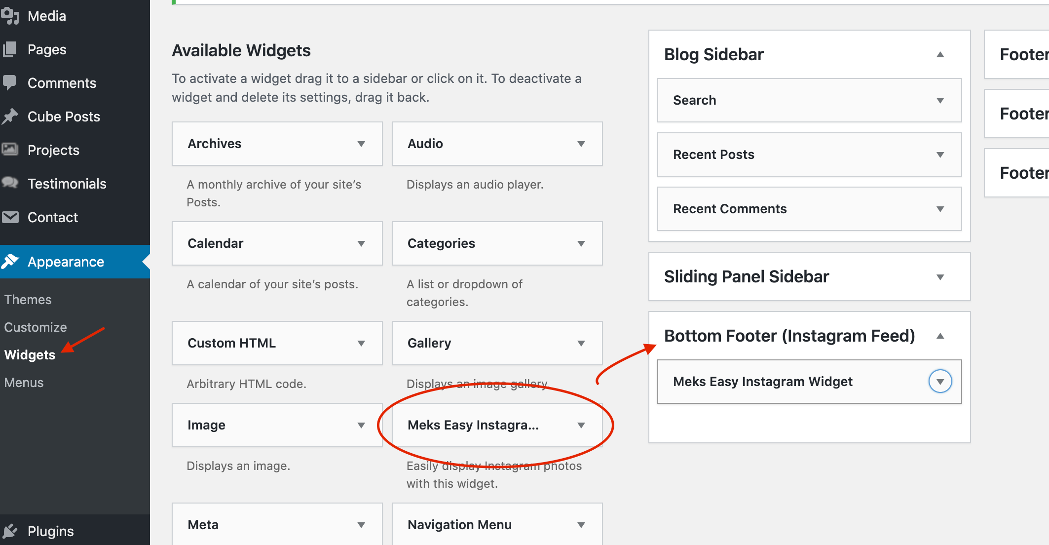 - Now just drag the Meks Easy Instagram Widget to the new sidebar