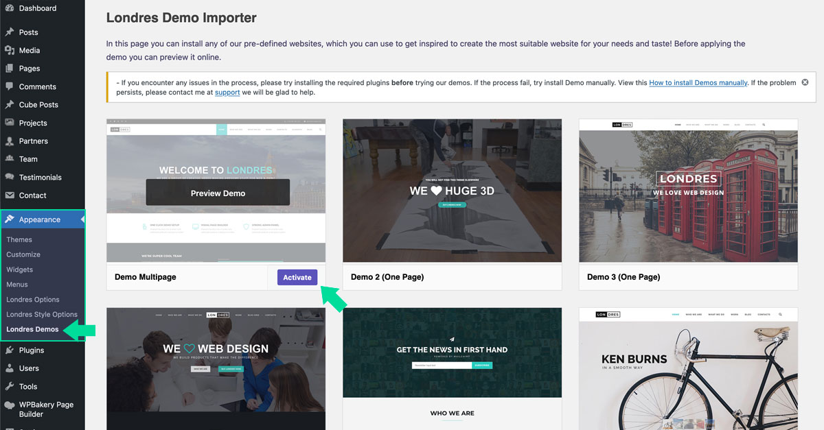 If you encountered any issue installing the demo via one click feature, or if you want to import more than one demo into your wordpress installation, You neet to install them manually. For that, inside the Londres Download package, you just need to choose the demo from the folder Preview Preview Demo Contents -> 6 Londres Demos. Check the following video.