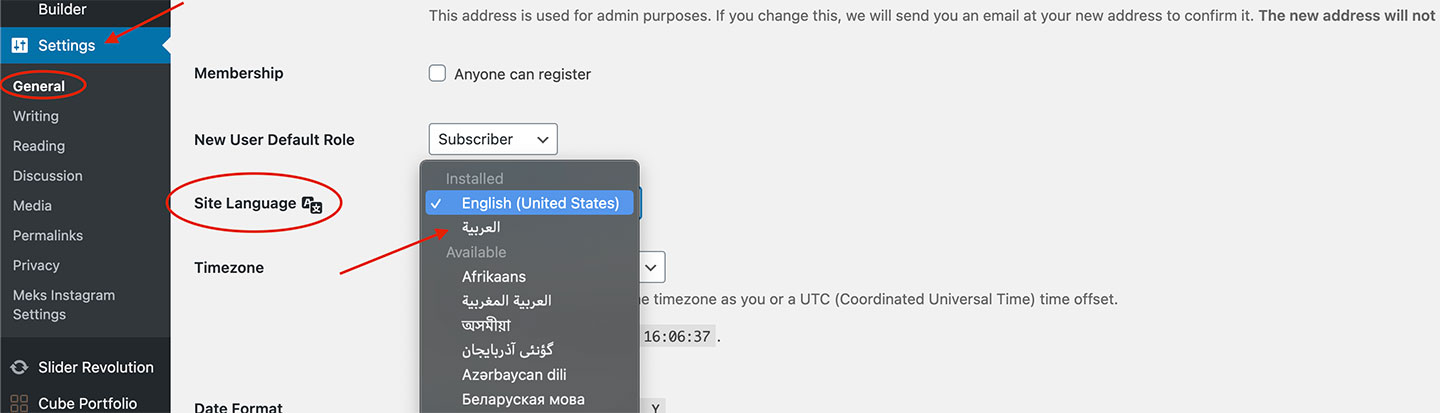 - 1. On the WordPress menu Go to Settings -> General -> Site Language change the language to your rtl language.