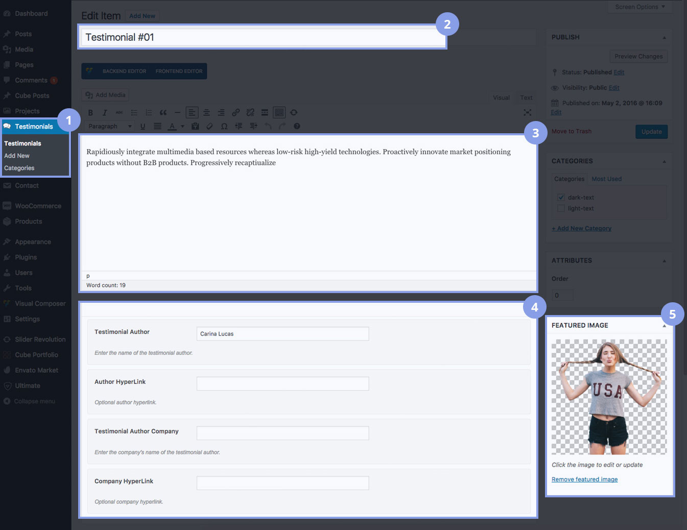 6. After you have all of this set up, just add your testimonial featured image, and then just save changes.