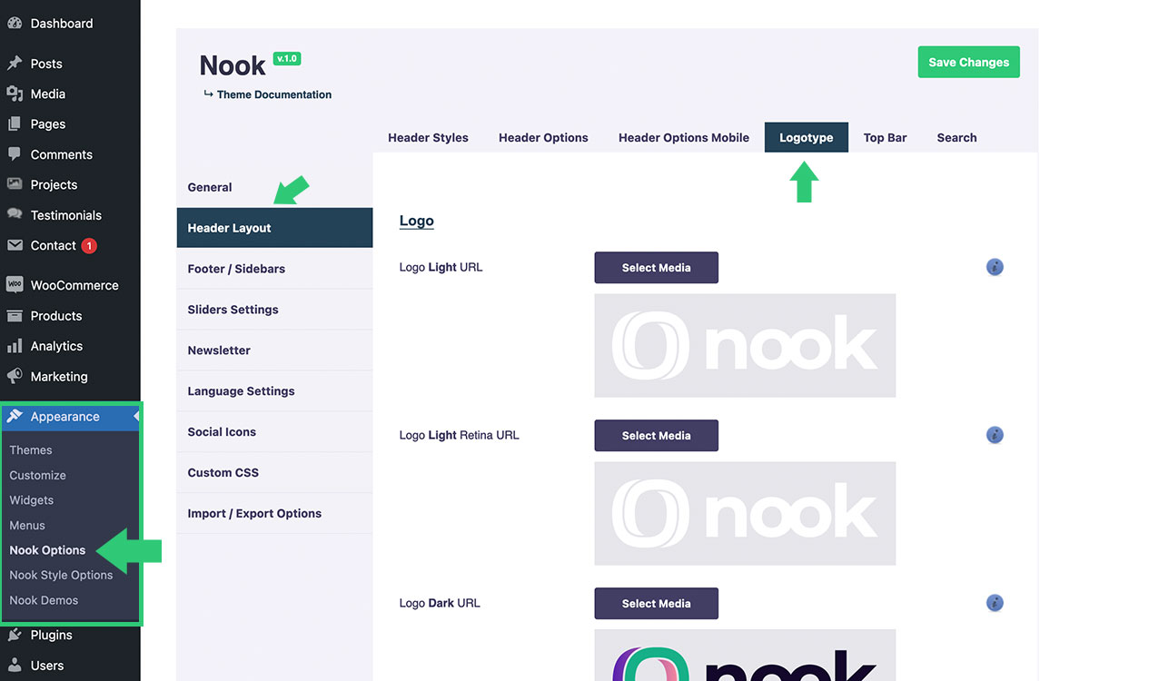 Go to menu Appearance -> Nook options -> Header Layout -> Logotype