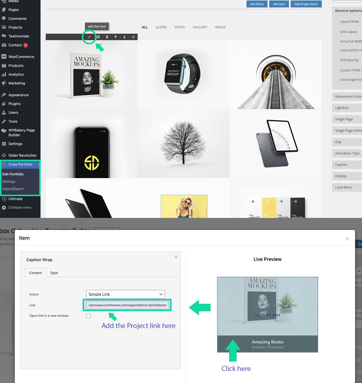 Now on the cube portfolio items, and depending of the type of project, Single Page, Single Page Inline or Simple link. Add the full project link in the field "Link"