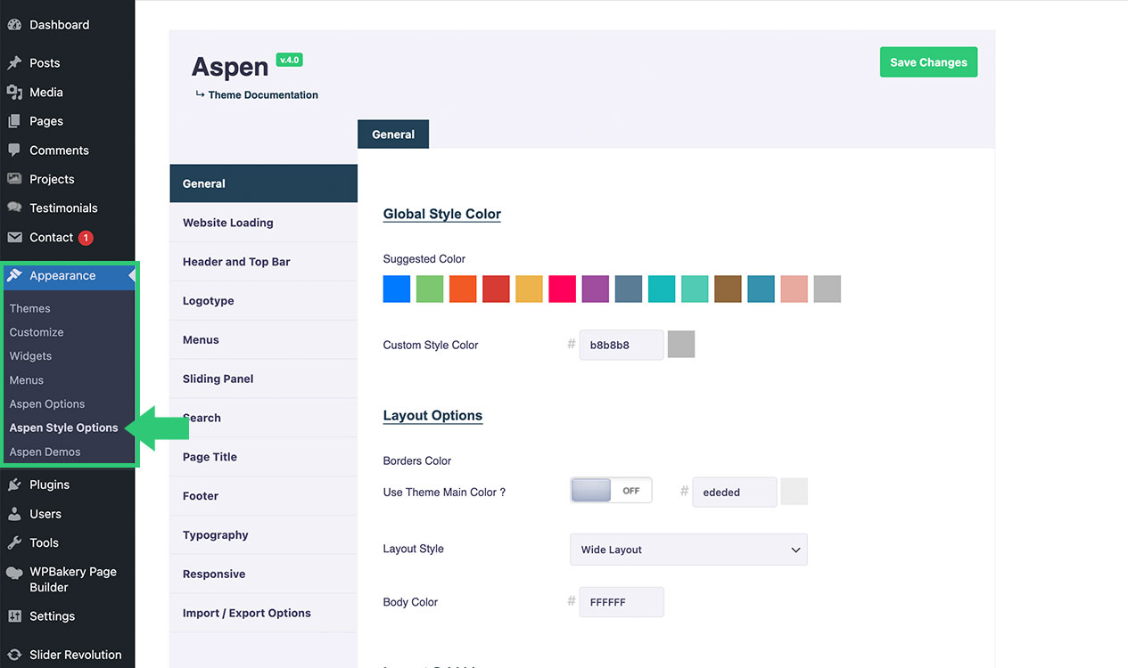 IMPORTANT: Style options, like color changes, styles, backgrounds, etc, are set over the next section Sanok Style Options.